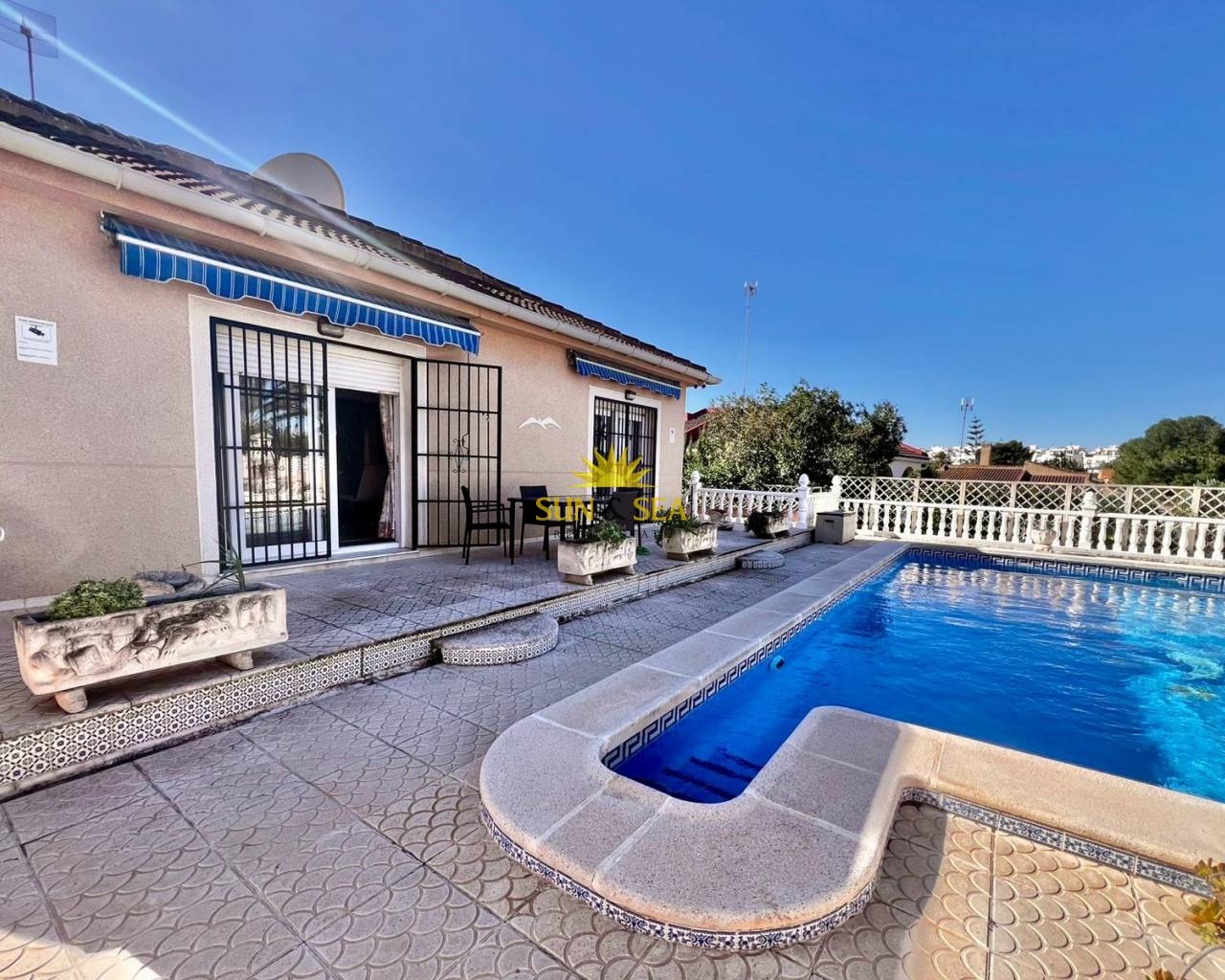 Espectacular villa independiente de 144 m2 construidos sobre una amplia parcela en esquina de 800 m2, perfecta para disfrutar de privacidad, espacio exterior y el mejor clima mediterráneo.~~La vivienda dispone de 2 dormitorios y 2 baños, con la ventaja de que los dormitorios son de gran tamaño, ofreciendo la posibilidad de crear más habitaciones según necesidades. Cuenta con dos amplios salones con chimenea, ideales para el confort en cualquier época del año, además de cocina independiente totalmente funcional.~~En el exterior encontrarás un acogedor porche, piscina privada, zona de barbacoa y amplias áreas para ocio o jardín. También incluye garaje en sótano y aire acondicionado.~~Sobre la zona: Los Balcones es una de las áreas residenciales más demandadas de Torrevieja, tranquila y bien comunicada, cercana a servicios, hospitales, supermercados y a pocos minutos de las playas y del centro comercial Zenia Boulevard.~~Una propiedad con muchísimo potencial, ideal tanto como residencia habitual como inversión.