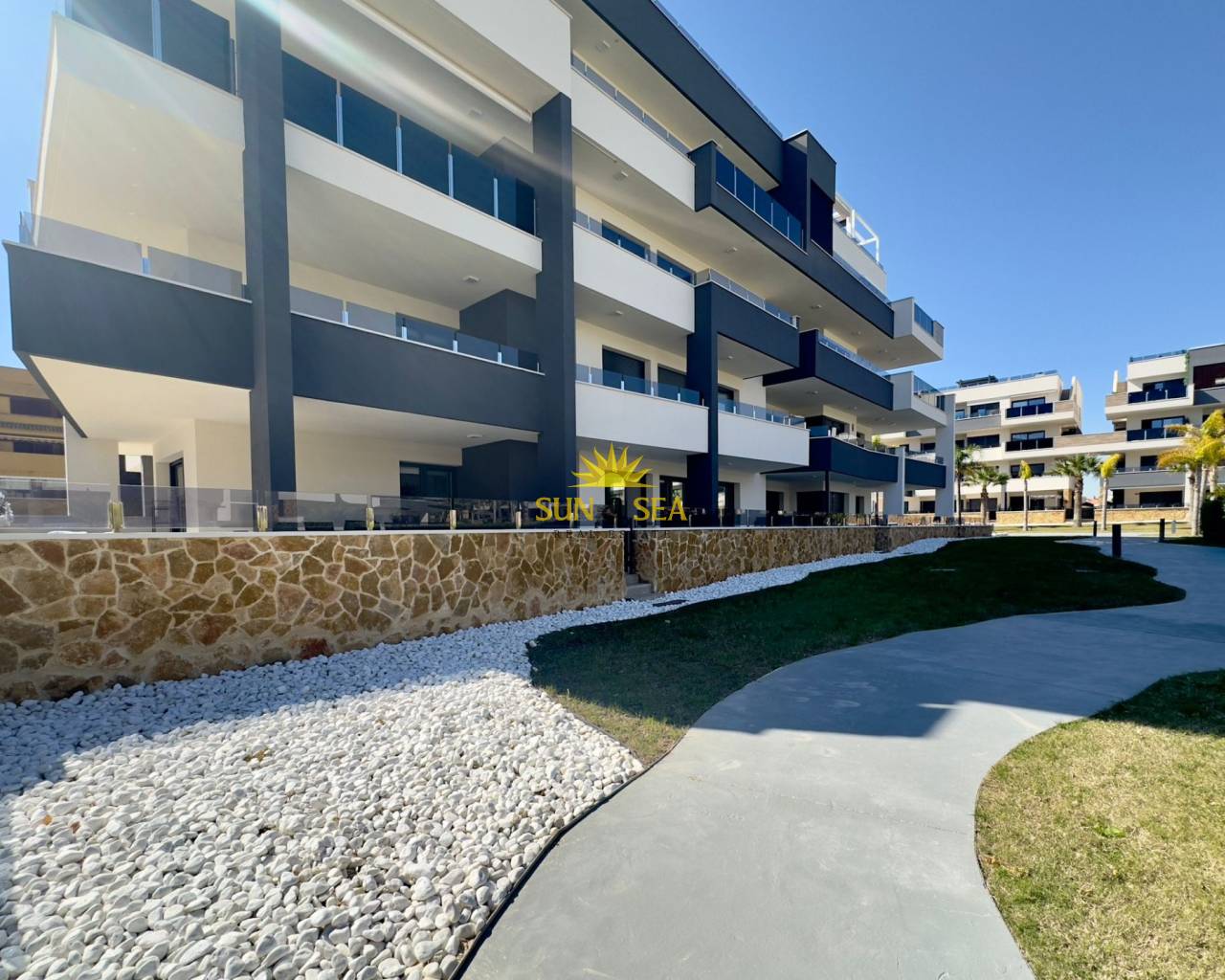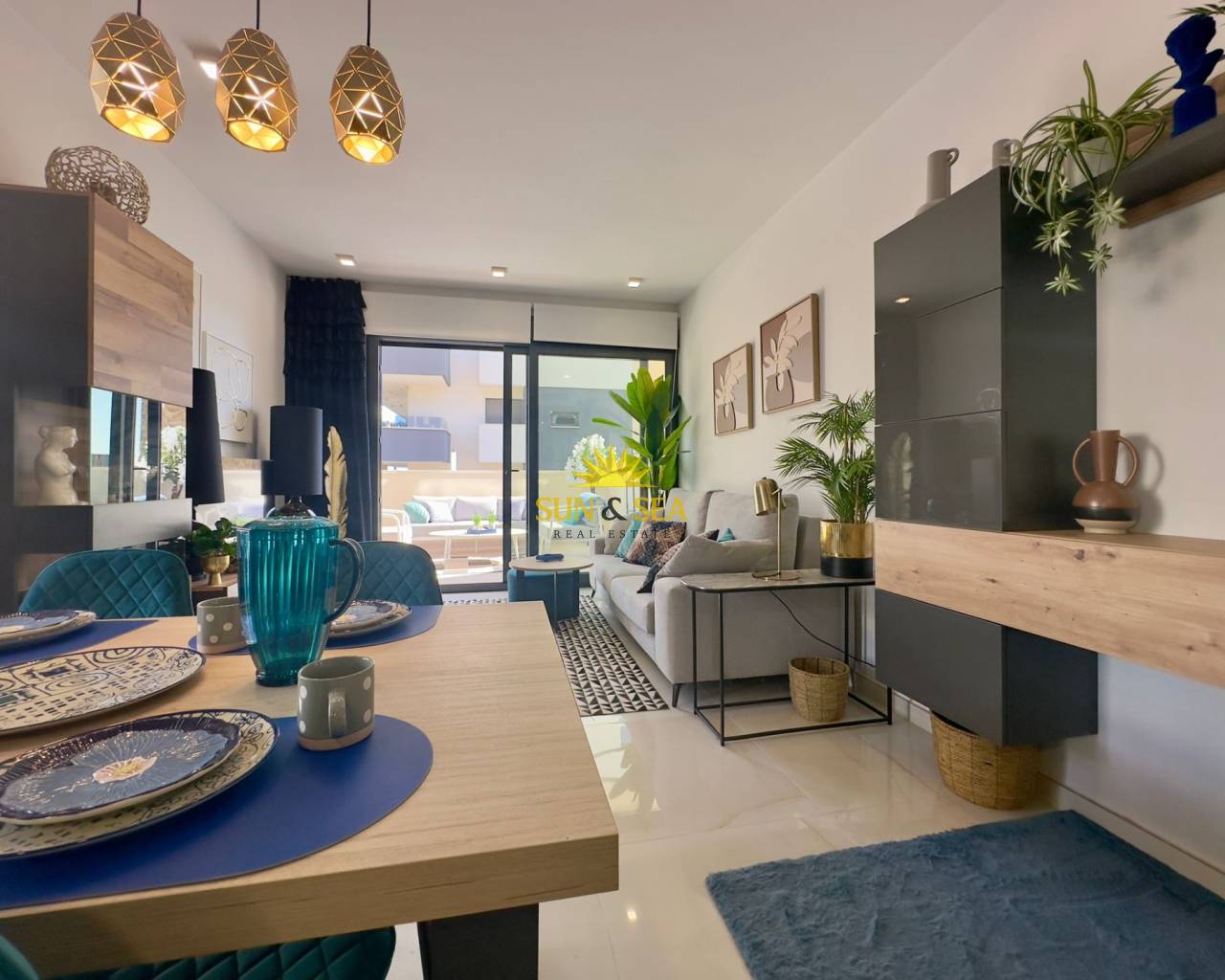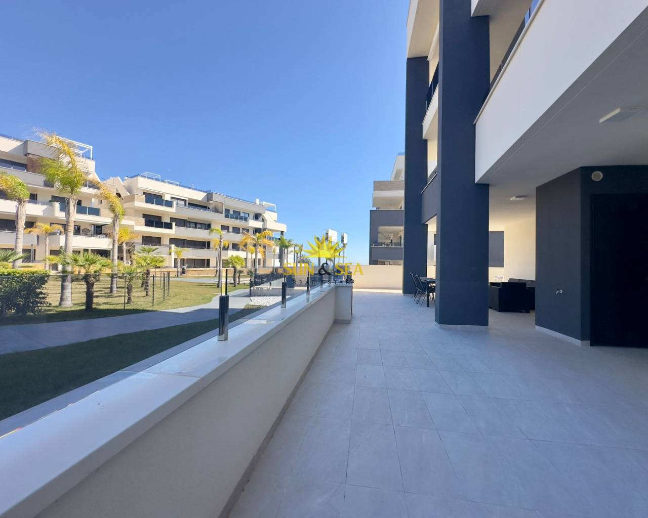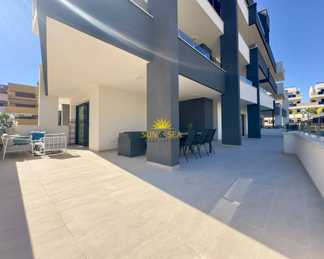 Descubre esta espectacular vivienda nueva a estrenar en el exclusivo residencial Amanecer Deluxe, ubicado en la codiciada zona de Playa Flamenca.~~Se trata de un amplio apartamento en planta baja que destaca por su impresionante terraza privada de aproximadamente 136 m2, ideal para disfrutar del clima mediterráneo todo el año, organizar reuniones al aire libre o simplemente relajarse con vistas despejadas al mar y a las zonas verdes.~~Características principales:~~3 dormitorios amplios, todos exteriores~~2 baños completos (uno de ellos en suite)~~Luminoso salón-comedor con acceso directo a la terraza~~Cocina moderna~~Vistas al mar y a jardines~~2 plazas de garaje incluidas~~Trastero incluido en el precio~~ Zonas comunes exclusivas:~~Amplias zonas verdes y ajardinadas~~Piscina comunitaria~~Parque infantil~~Gimnasio totalmente equipado~~Sauna~~Una vivienda perfecta tanto como residencia habitual, segunda vivienda o inversión, gracias a su amplitud, privacidad y excelentes prestaciones.