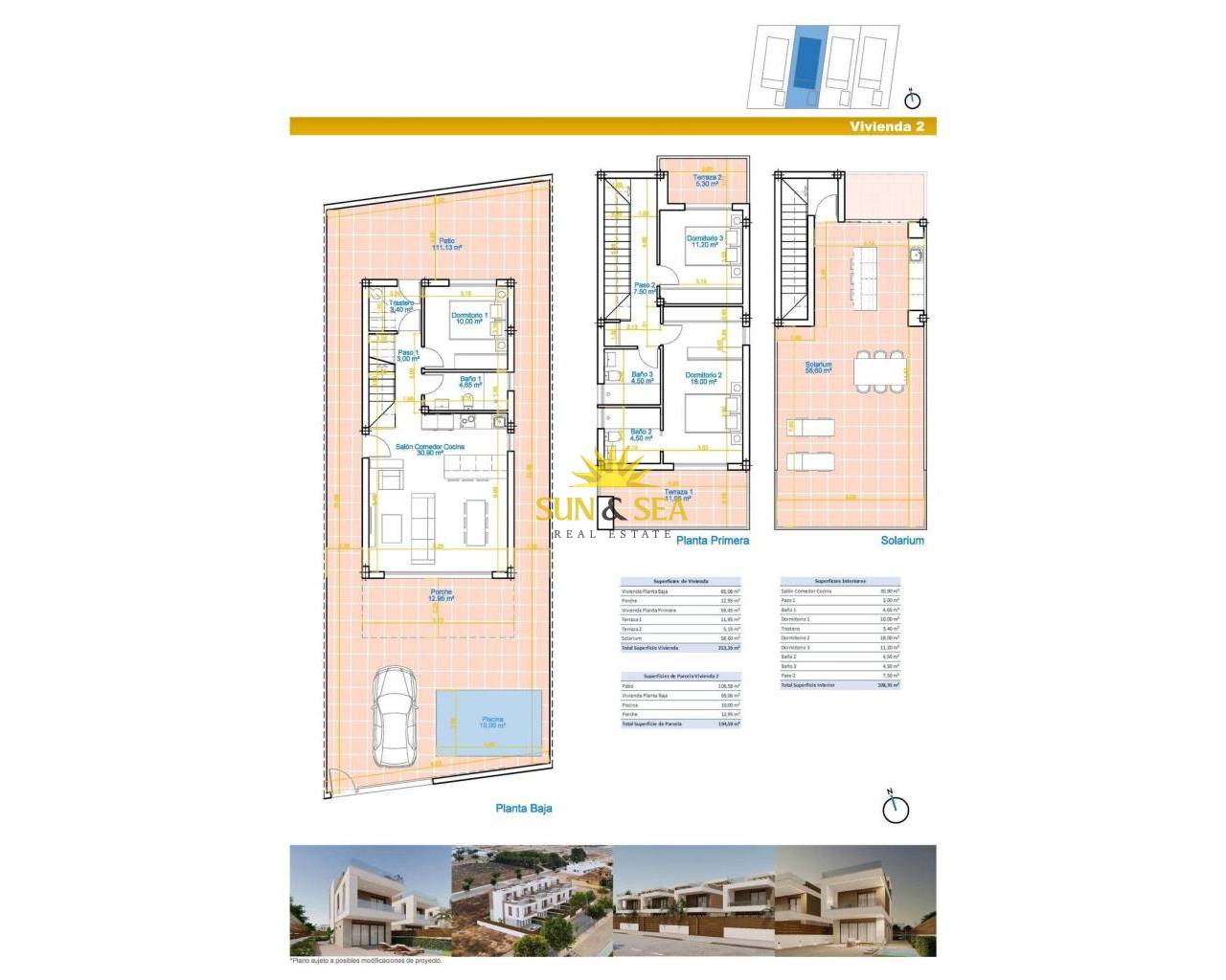 Villas de nueva construcción con piscina privada en Pilar de la Horadada, cerca de la playa Exclusiva promoción de villas modernas en la Costa Blanca Descubra esta promoción boutique de tan solo cuatro villas independientes en Pilar de la Horadada, una de las localidades costeras más atractivas del sur de la Costa Blanca. Con una ubicación ideal a solo 2 km de la playa de Las Higuericas y a poca distancia a pie del centro de la localidad, estas viviendas ofrecen la combinación perfecta de privacidad, comodidad y estilo de vida mediterráneo. Situadas en una tranquila zona residencial con orientación sur, cada villa disfruta de luz solar durante todo el día, lo que las hace especialmente atractivas para compradores internacionales que buscan disfrutar de la vida al aire libre durante todo el año. Diseño contemporáneo con opciones de personalización Una de las características más destacadas de esta promoción es la posibilidad de personalizar su vivienda para adaptarla a su estilo de vida y preferencias. Estas modernas villas están diseñadas pensando en la funcionalidad y el confort, combinando líneas arquitectónicas limpias con espacios habitables prácticos. Cada propiedad se distribuye en dos plantas más un solárium privado en la azotea. La planta baja cuenta con un amplio salón-comedor diáfano con cocina integrada, acceso directo al porche delantero, un dormitorio, un cuarto de baño y un trastero con acceso al patio trasero. La primera planta ofrece dos dormitorios adicionales y dos cuartos de baño, incluido un dormitorio principal con baño en suite. Ambos dormitorios tienen acceso a terrazas privadas, creando espacios luminosos y aireados. Solárium privado y espacios al aire libre El solárium de la azotea está diseñado para disfrutar del clima mediterráneo y cuenta con una cocina de verano, una ducha exterior y preinstalación para un jacuzzi y paneles solares. Cada villa incluye también una piscina privada y aparcamiento en la parcela. Estos espacios al aire libre ofrecen el entorno ideal para relajarse, recibir invitados y disfrutar del soleado estilo de vida de la Costa Blanca durante todo el año. Acabados de alta calidad y prestaciones modernas Las villas están construidas con altos estándares de calidad e incluyen prestaciones de primera clase, como puerta de seguridad reforzada, cocina totalmente equipada con electrodomésticos, aire acondicionado por conductos, persianas eléctricas y sistema aerotérmico para agua caliente. Los baños están completamente equipados con muebles, espejos, mamparas de ducha y calefacción por suelo radiante. Un paquete de iluminación LED y espacio de almacenamiento adicional mejoran aún más el confort y la funcionalidad. Ubicación privilegiada cerca de playas y campos de golf Pilar de la Horadada es conocida por su encanto tradicional español, su animada calle principal y sus excelentes servicios locales, que incluyen tiendas, restaurantes y cafeterías. La localidad ofrece fácil acceso a algunas de las mejores playas y campos de golf de la región. Las principales distancias son: playa de Las Higuericas a 2 km, playa de Torre de la Horadada a 3 km, playa de Mil Palmeras a 3 km, Lo Romero Golf a 6 km, el Aeropuerto Internacional de Murcia a 45 km y el Aeropuerto de Alicante a 75 km. Oportunidad ideal de inversión o vivienda vacacional Estas villas de nueva construcción ofrecen una excelente oportunidad para adquirir una propiedad moderna cerca de la playa en una ubicación muy codiciada de la Costa Blanca. Póngase en contacto con nosotros hoy mismo para recibir más información o concertar una visita y asegurarse su nuevo hogar bajo el sol.