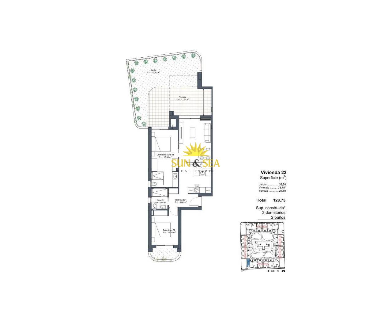 Exclusivas Viviendas de Obra Nueva en Lo Marabú, Ciudad Quesada Diseño Moderno y Máximo Confort en un Entorno Mediterráneo Descubra este espectacular complejo residencial en Lo Marabú, Ciudad Quesada, compuesto por 80 viviendas de 2 y 3 dormitorios con 2 baños. Diseñadas con un enfoque moderno y eficiente, estas propiedades ofrecen amplias terrazas, ventilación cruzada y acabados de alta calidad para maximizar el confort y la eficiencia energética. Las viviendas en planta baja cuentan con jardines privados, mientras que las de la planta alta disponen de soláriums privados con preinstalación para jacuzzi y ducha exterior. Además, el residencial dispone de piscinas comunitarias rodeadas de jardines, creando un ambiente perfecto para el relax y la convivencia. Características de Alta Calidad para un Estilo de Vida Exclusivo Cada vivienda ha sido diseñada para ofrecer el máximo confort, con materiales de primera calidad y un diseño contemporáneo: Amplios ventanales correderos de aluminio con rotura de puente térmico. Persianas motorizadas para mayor comodidad. Cristales Climalit 4+4/14/4+4 para aislamiento térmico y acústico. Puerta de entrada acorazada con cerradura de seguridad. Cocinas totalmente amuebladas con electrodomésticos incluidos. Baños con muebles, espejos y mamparas de ducha. Sistema de aerotermia de 150L para agua caliente. Instalación completa de aire acondicionado por conductos (frío/calor). Iluminación en todas las estancias ya incorporada. Plaza de parking incluida. Gracias a su diseño pasante de doble fachada, las viviendas ofrecen ventilación natural cruzada, proporcionando frescor en verano y reduciendo el consumo energético en climatización. Ubicación Privilegiada en Ciudad Quesada Lo Marabú es una exclusiva zona residencial dentro de Ciudad Quesada (Rojales), rodeada de espacios naturales y con todos los servicios a su alcance. La urbanización se encuentra muy cerca de las Lagunas Saladas de La Mata y Torrevieja, un entorno ideal para disfrutar de la naturaleza y mejorar el bienestar. Desde su nueva vivienda, tendrá acceso rápido a los principales puntos de interés de la zona: Playas de Guardamar del Segura y Torrevieja – 10 km (15 minutos en coche). Aeropuerto de Alicante-Elche (ALC) – 38 km (35 minutos en coche). Aeropuerto de Murcia-Corvera (RMU) – 65 km (50 minutos en coche). Campos de golf de prestigio – A menos de 5 km. Centros comerciales y restaurantes – A pocos minutos. Acceso rápido a las carreteras AP-7 y N-332, conectando con toda la Costa Blanca. Un Hogar Perfecto para Disfrutar del Mediterráneo Con su combinación de diseño moderno, ubicación estratégica y entorno natural excepcional, estas viviendas en Lo Marabú son ideales tanto para residencia permanente, casa de vacaciones o inversión inmobiliaria. No pierda esta oportunidad única. Contáctenos hoy mismo para más información o para concertar una visita a su futura vivienda en Ciudad Quesada.