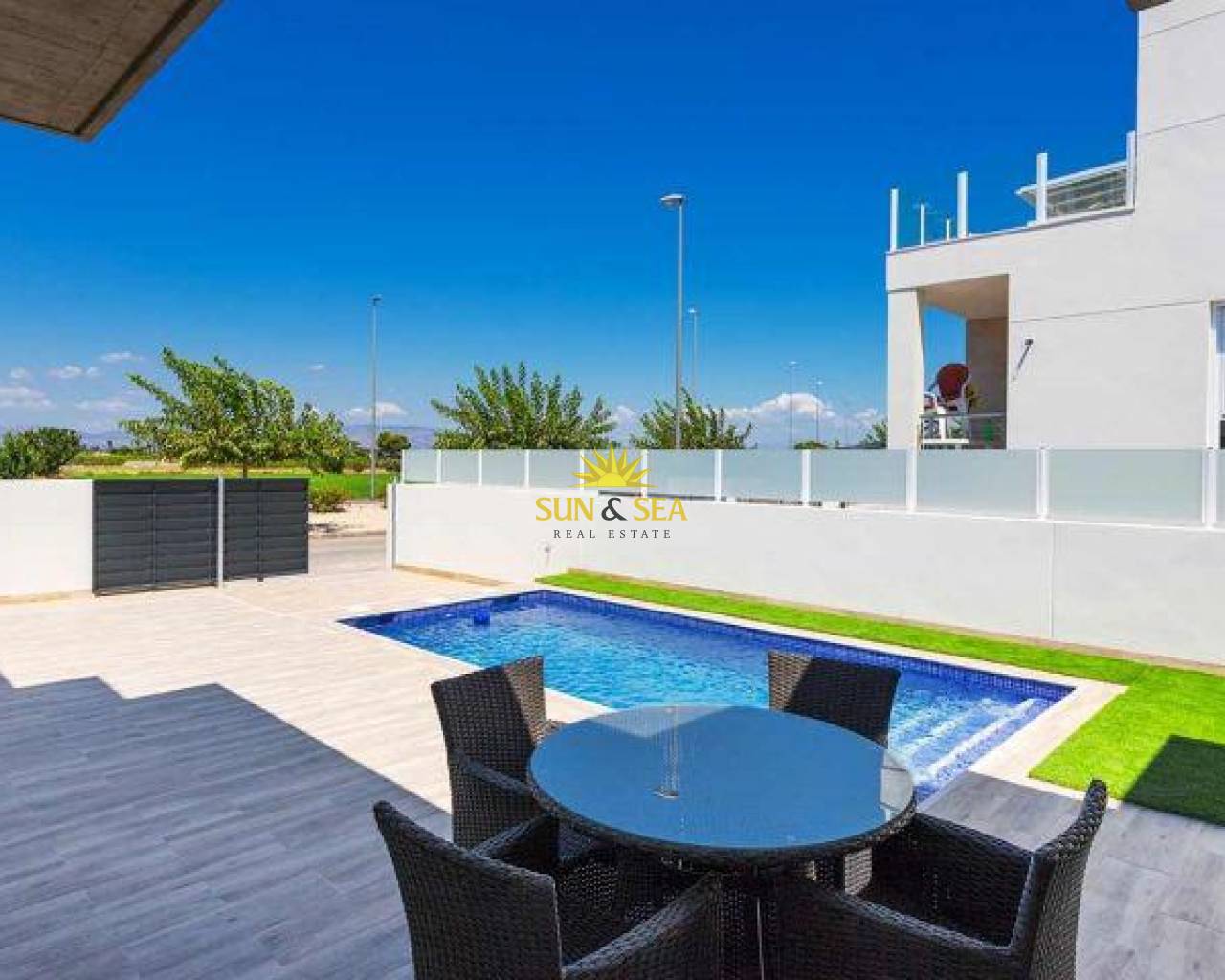 VILLA DE DISEÑO MEDITERRANEO CERCA DE TODO Villa de 3 dormitorios con armarios empotrados y 2 baños y con 18 m2 de terraza. El salón comedor ofrece acceso directo a la piscina privada y a los espacios exteriores. Cerca de todos los servicios, estas villas se construyen en un típico pueblo español de la Vega Baja, al sur de Alicante, ofreciendo sol y tranquilidad durante todo el año. Con su fácil acceso a la A37 que conecta Alicante con Cartagena y su proximidad a todos los pueblos costeros, Daya Nueva se ha convertido en un lugar de residencia perfecto tanto para disfrutar de sus vacaciones como para vivir en él. Distancia a la playa 13 km, distancia al aeropuerto 40 km, distancia al golf 8km