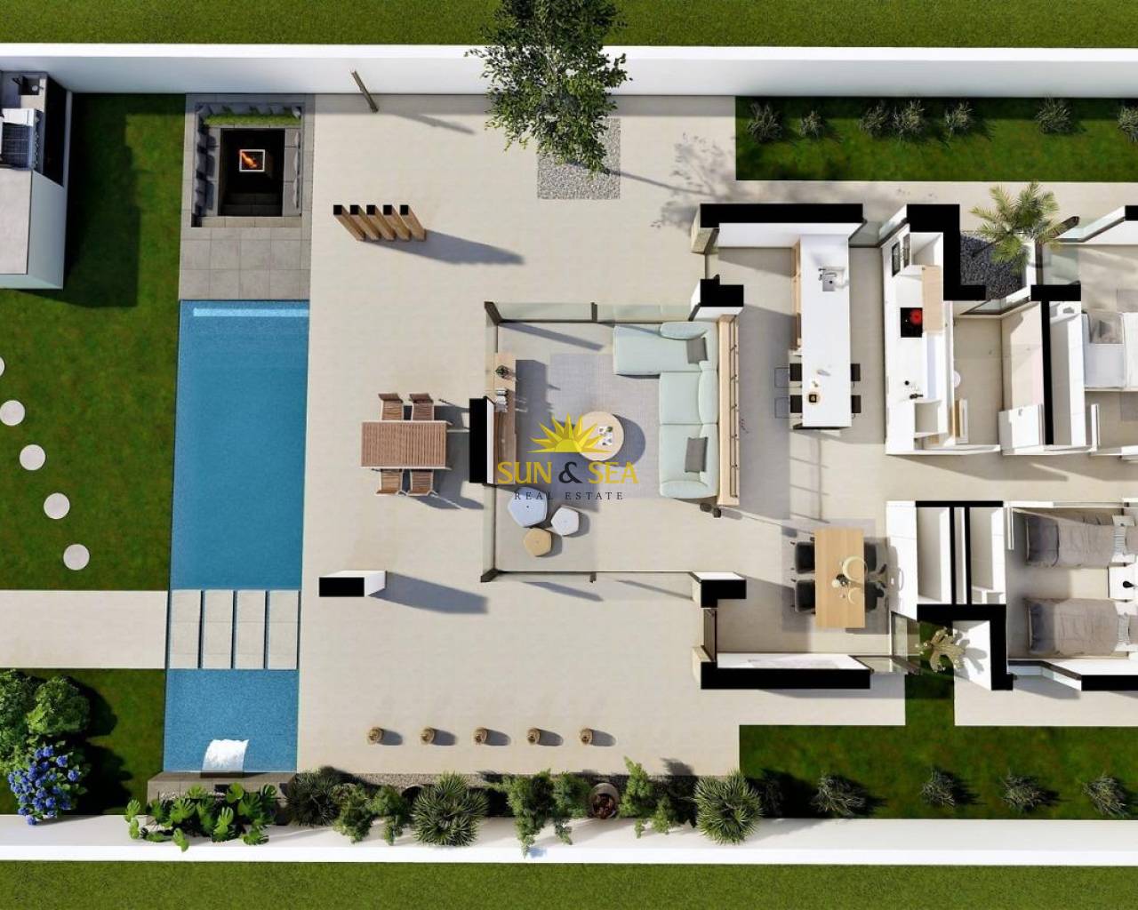 VILLAS NEUVES A SAN FULGENCIO Villas neuves à San Fulgencio, à seulement 5 km de la plage. Les villas offrent 3 chambres, 2 salles de bains et une cuisine spacieuse, une salle à manger, un salon, une piscine avec cascade et deux piscines : une piscine de 1,95x2,60 m et 0,6 m de profondeur, et une piscine de 5,60x2,60 m, entre 1 et 1,5 m de profondeur variable. Un grand porche orienté au sud permet la continuité du salon avec l'extérieur, s'ouvrant sur un espace extérieur moderne et fonctionnel où l'on peut profiter de la piscine privée, du barbecue, du chillout et du grand jardin qui l'entoure. Les lignes simples et claires du mobilier contribuent à son intégration au reste de la maison. Les détails en bois ajoutent de la chaleur à l'atmosphère. Les salles de bains, où les couleurs sont combinées à des tons naturels et chauds, créent une atmosphère chaleureuse qui, associée à la relation directe avec l'extérieur, vous permet de vous connecter à la nature et d'atteindre de grands moments de détente. La chambre principale dispose d'un patio privé qui, avec la lumière qui pénètre par les fenêtres, crée une atmosphère relaxante, parfaite pour le repos et la détente. San Fulgencio est un village agréable avec plusieurs restaurants et magasins. Il est très bien situé, à proximité des fantastiques plages de La Marina et de la ville de Guardamar, légèrement plus grande. La ville de San Fulgencio est située à environ 30 minutes de l'aéroport d'Alicante-Elche, à 6 km du terrain de golf le plus proche et à seulement 5 km de la plage la plus proche.