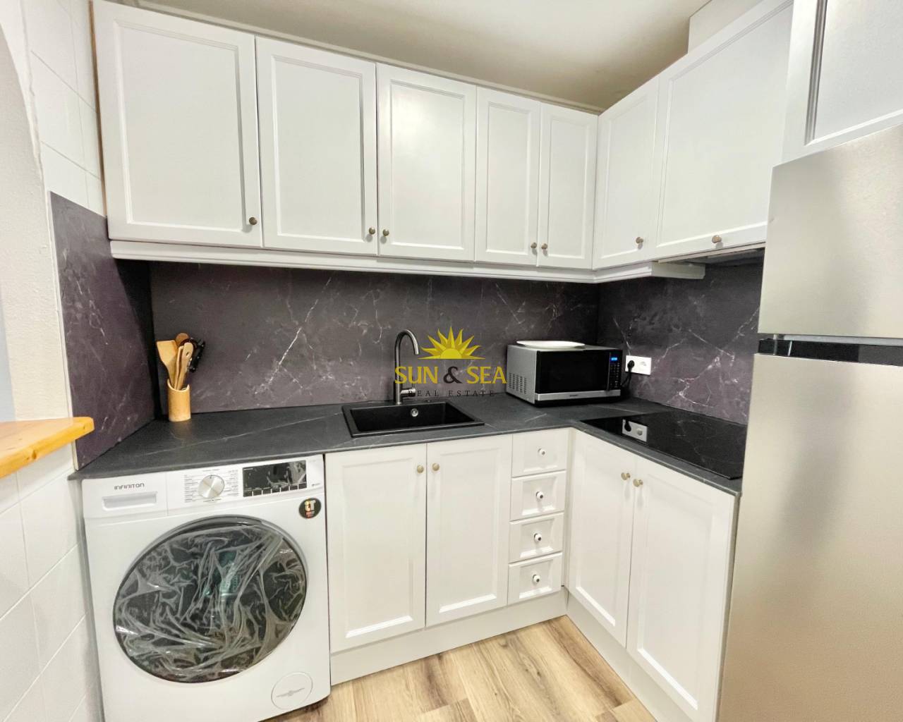Agréable studio en rez-de-chaussée, idéal pour une ou deux personnes, situé dans un quartier confortable et bien desservi de Torrevieja. Le logement est lumineux, fonctionnel et prêt à être occupé. Il dispose de 32 m² construits, parfaitement agencés.