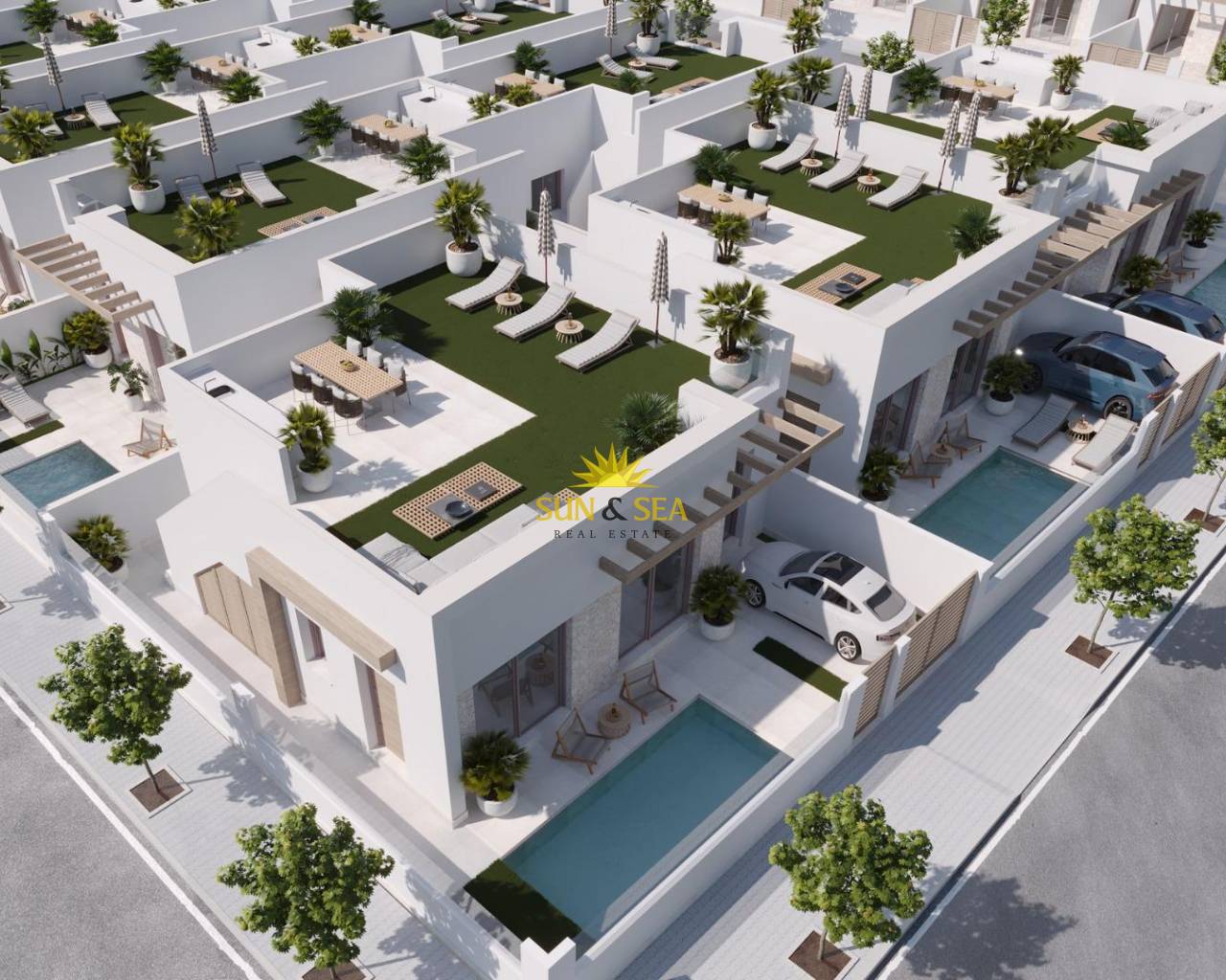 NEW BUILD SEMI-DETACHED VILLAS IN ROLDAN New Build semi-detached villas in Roldan, Torre Pacheco. Modern villas build over one floor, has 2 or 3 bedrooms, 2 bathrooms, open plan kitchen with the lounge area, fitted wardrobes, private solarium. All villas has private garden with pool and parking space. Roldan itself is a traditional town with all the local amenities you will need including Supermarkets, Restaurants, Bars, Health Clinic, Pharmacy, Police Station, Petrol Station, Mechanics, Dentists, Doctors and more. The nearby golf resorts of La Torre, & Terrazas are easily accessible, Corvera Airport is 15 minutes away & the beaches of the Mar Menor just 20 minutes drive.