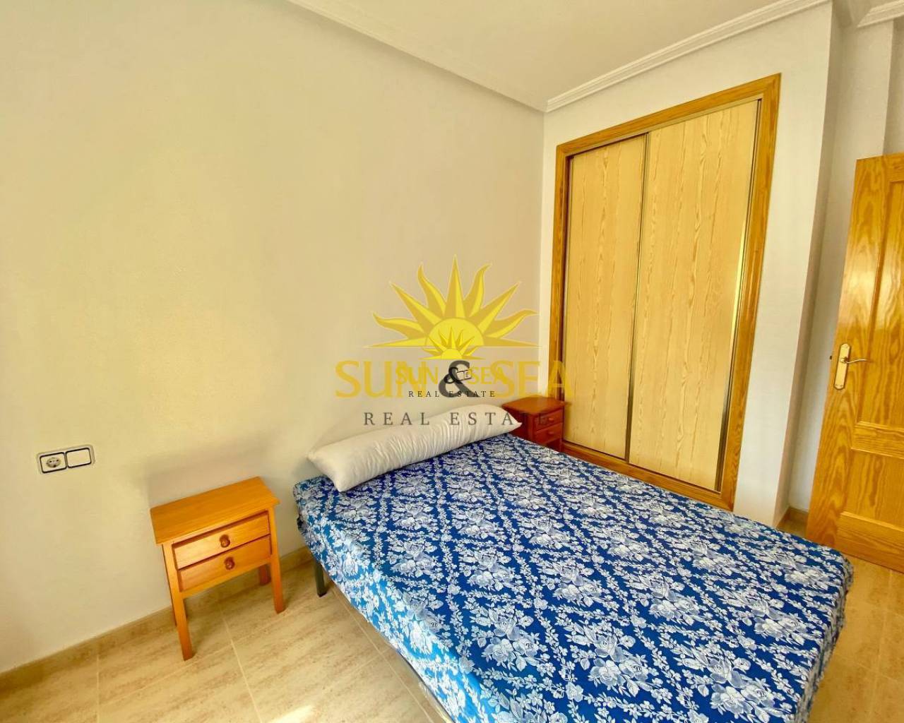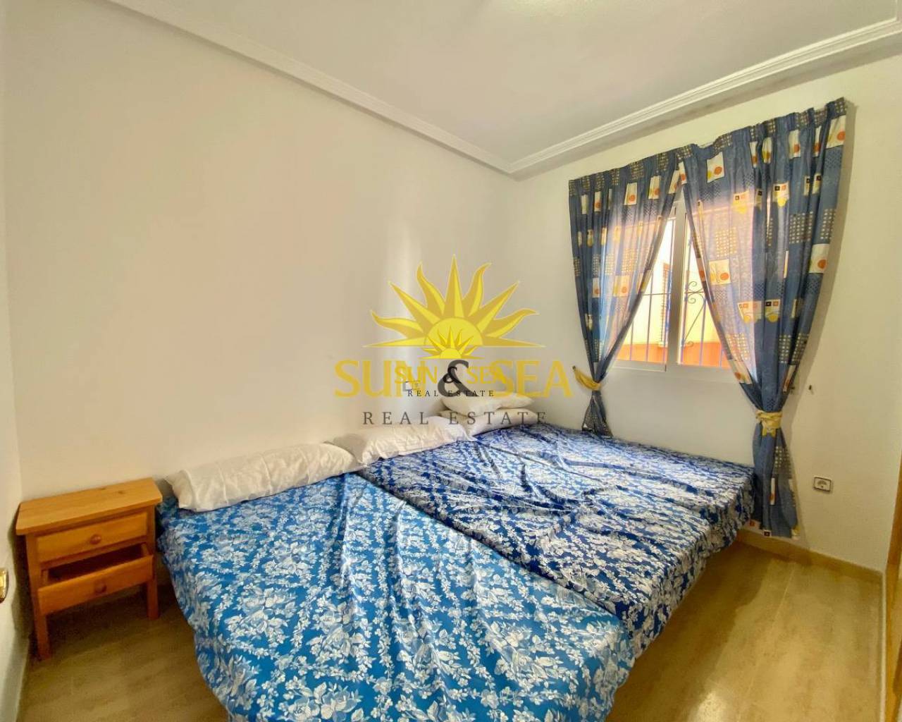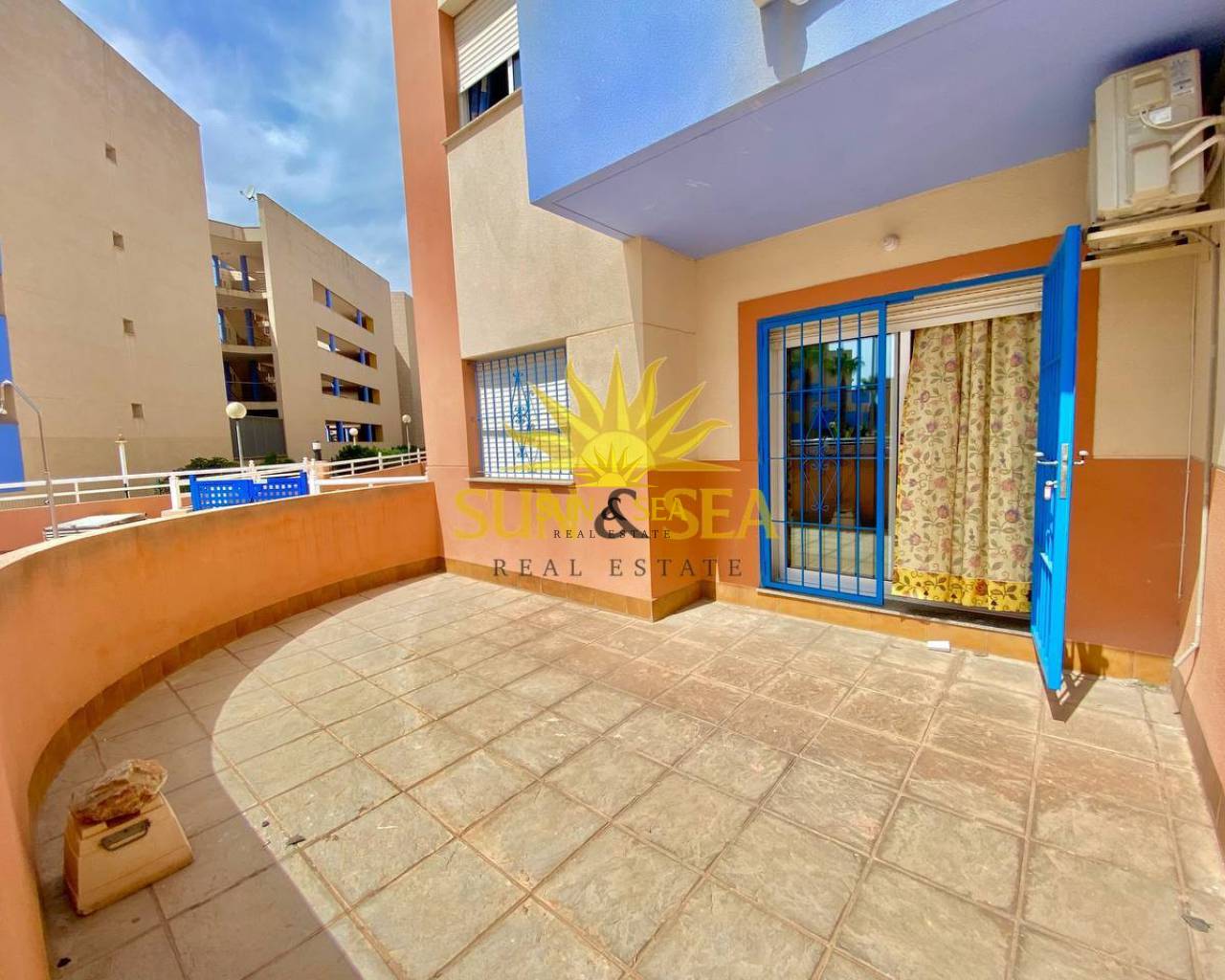 The apartment is located on a ground floor and has a community pool.
