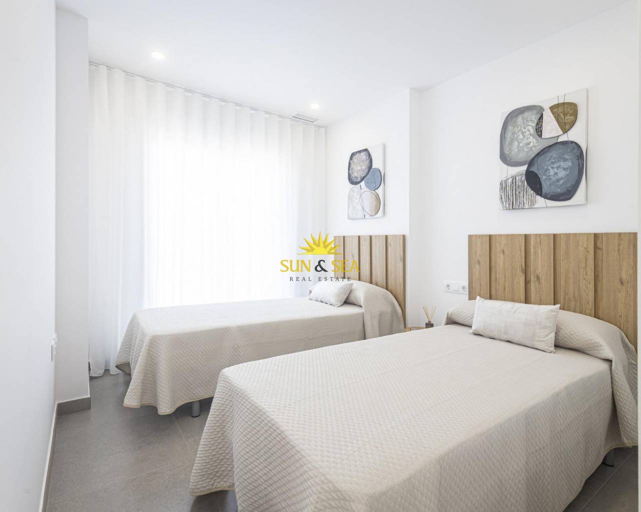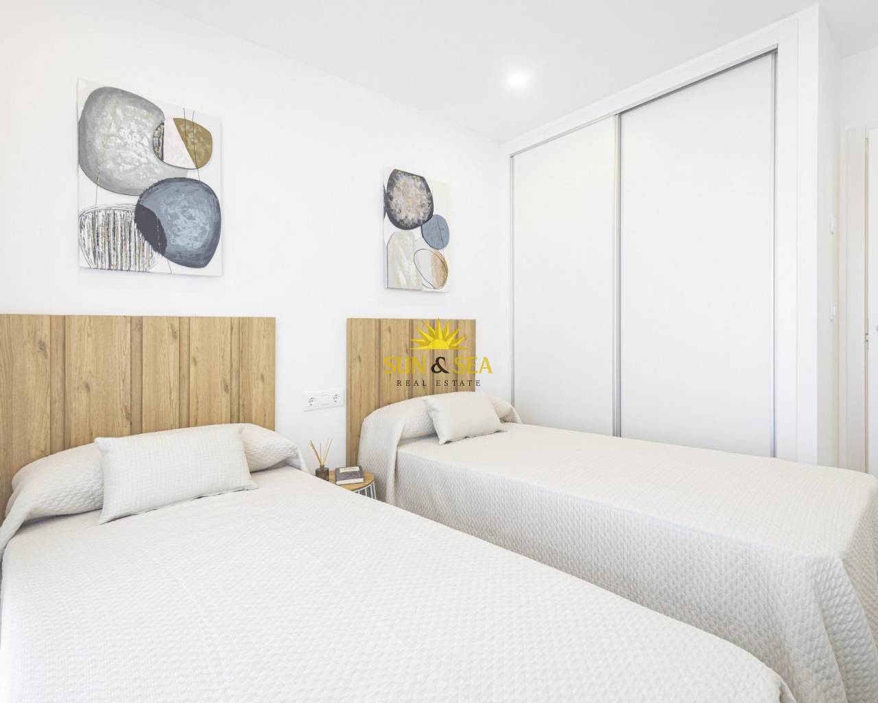BEAUTIFUL SEA VIEW APARTMENTS IN LA MANGA This urbanization is located in the largest expansion area of ​​La Manga. In this new urbanization the homes have been designed to take advantage of every corner of the house, as well as the care in choosing the materials and their design. Apartments with armored entrance door and doors lacquered in white with stainless steel fittings. White, monobloc blinds and double glazing with air chamber. In the master bedroom built-in wardrobe with sliding doors, with a separating shelf in the mezzanine, a bar and a chest of three drawers. Kitchen with high and low furniture, in white, gola-type handle, single sink with drainer, ceramic hob, electric oven and extractor hood. Pre-installation of air conditioning (cold and heat) through conduits with provision of zoning of rooms. La Manga del Mar Menor is a natural strip of land surrounded by two seas, the Mar Menor and the Mediterranean Sea. To this rarity you can add the multiple leisure and free time options, restaurants, supermarkets, medical centers, pharmacies, nautical sports centers, golf courses. La Manga is located on the north coast of the Costa Calida and is a popular holiday destination for tourists. The narrow land strip separating the warm lagoon and the colder sea has a unique microclimate. It’s one of the most exotic areas in Spain. Corvera airport is about 1 hour drive away and Alicante airport about 2 hours away.