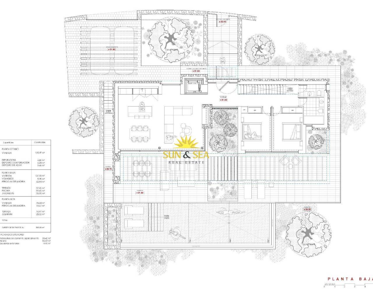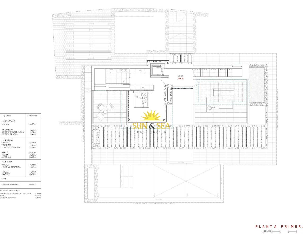 Contemporary Villa with Panoramic Sea Views in La Fustera, Benissa Costa This exclusive new-build villa, designed by a renowned architect and developed by a local developer with more than 20 years experience, sits on an 800 m² plot just a few steps from La Fustera Beach. Blending Mediterranean warmth with contemporary elegance, the architecture combines natural stone, wood, and soft neutral tones, integrating seamlessly with the coastal landscape. With a total built area of 716 m² distributed over three levels - basement, ground floor, and first floor - the villa offers a perfect balance between functionality, design, and comfort. Basement Level The lower floor of 105.97 m² is designed for both practicality and leisure. It includes a fully equipped gym, laundry room, and technical areas, with the option to adapt additional spaces as a wine cellar, cinema, or multipurpose room. This level also houses the pool’s filtration system and water tanks, ensuring efficient management of all technical installations. Ground Floor The main level, with 137.93 m², unfolds in a bright open-plan layout that captures the essence of Mediterranean living. The spacious living room, dining area, and kitchen open through large floorto-ceiling windows onto the main terrace and infinity pool, framing incredible panoramic sea views that define the character of this home. Two double bedrooms, a full bathroom, and a guest toilet complete this floor, providing comfort and functionality. Outside, a wooden pergola shades the outdoor lounge and dining areas, surrounded by lush gardens, sun terraces, and a 59.40 m² infinity pool that visually merges with the sea. First Floor The upper level, with 70.19 m², is reserved for the master suite - a private retreat featuring a walk-in closet, en-suite bathroom, and a large private terrace with breathtaking views of the Mediterranean Sea. A second bedroom or office space completes this floor, which also provides access to a 25.02 m² solarium, ideal for relaxing under the sun and enjoying the serenity of the surroundings. Exterior and Location Located on a quiet residential street surrounded by modern villas, this property enjoys an exceptional position just a 3-minute walk from La Fustera Beach (150m), the Mandala Beach Bar & Restaurant, and essential amenities such as supermarkets and local services. Designed with an emphasis on light, space, and seamless indoor-outdoor living, this villa embodies the modern Mediterranean lifestyle - elegant, relaxed, and in perfect harmony with its spectacular panoramic sea views. Secure your dream villa in La Fustera, Benissa Costa, and embrace the ultimate Mediterranean lifestyle with breathtaking sea views and unmatched comfort.