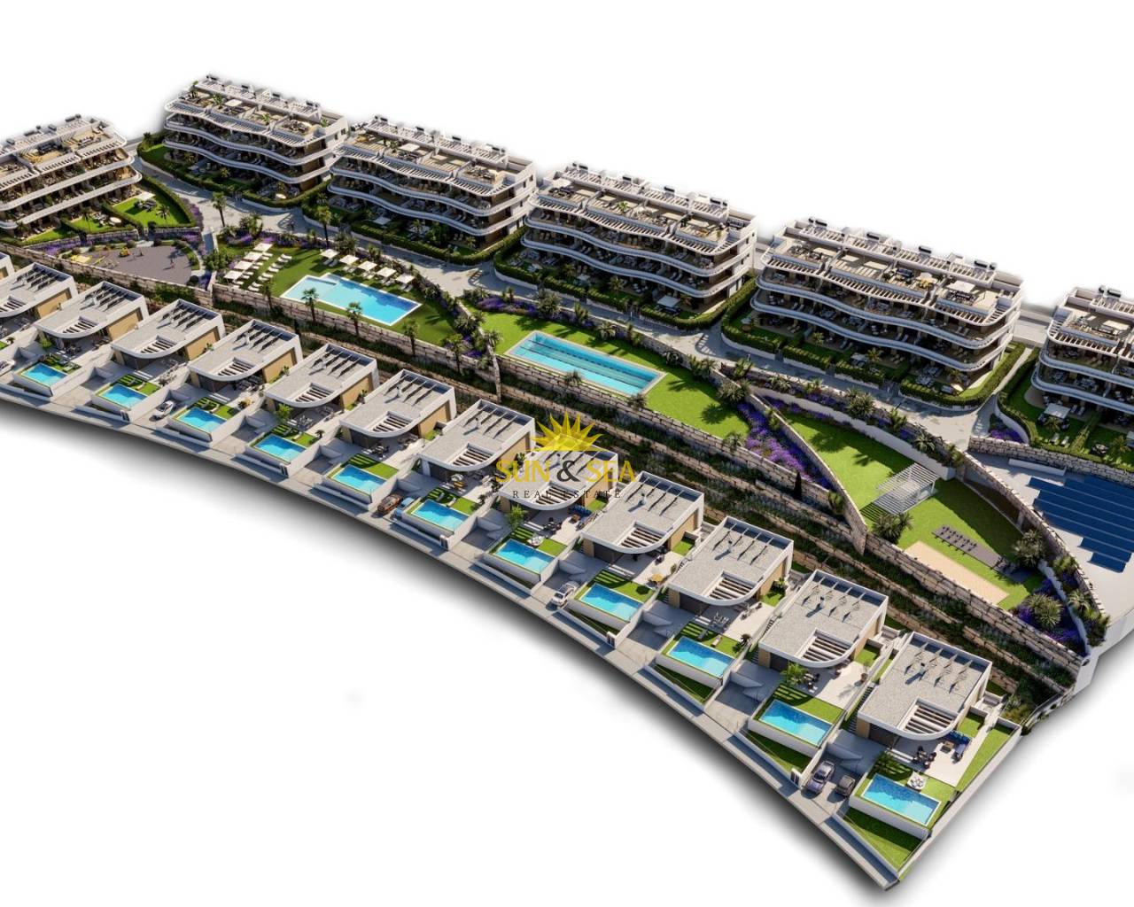 Luxury New Build Apartments and Villas with Panoramic Sea Views in Finestrat Exclusive Mediterranean Living near Benidorm Discover an exceptional new luxury residential development offering apartments, most of them with seaviews, and private villas in the prestigious area of Finestrat, just minutes from the vibrant city of Benidorm and its golden beaches. Nestled between the mountains and the Mediterranean Sea, this privileged location provides a peaceful environment with quick access to fine dining, premium shopping, international schools, golf courses and marina services. Alicante Airport is approximately 55 km away, while the sandy beaches of Benidorm and the charming old town are just 3 km and 4 km away respectively. Modern Architecture and Premium Design Designed for those seeking elegance, modern comfort and a high quality Mediterranean lifestyle, this exclusive resort features innovative architecture and spacious terraces that offer unobstructed sea views and sun exposure throughout the year. Each property is built to the highest standards with generous interiors, floor to ceiling windows and seamless indoor outdoor integration. Choose from 2 and 3 bedroom luxury apartments available in ground floor units with private gardens, middle floors with large sea view terraces, or stunning penthouses with private solariums. Exclusive 3 bedroom villas are also available, featuring single level layouts, private pools and basements, ideal for permanent living or high yield investment. Premium Finishes and Advanced Smart Home Technology Homes include fully fitted and equipped kitchens, ducted air conditioning, furnished bathrooms, shower screens and built in wardrobes. All units come with a smart alarm system, app controlled blinds and lighting, with upgrade options available for additional home automation features. Private parking and storage rooms are included. Resort Style Amenities Enjoy a sophisticated lifestyle with exceptional communal facilities including • Recreational pools and sunbathing areas • 25 meter swimming pool • Fully equipped gym and multipurpose area • Outdoor fitness and pilates space • Petanque court • Childrens play area • Extensive landscaped gardens with native plants • Solar energy system for resort consumption Sustainable and Energy Efficient Living Built with high efficiency materials, this development offers top energy performance with an A energy rating and solar power solutions to reduce environmental impact. Prime Location and Easy Access • Benidorm beaches 3 km • La Marina Shopping Center 1 km • Puig Campana Golf 3 km • Benidorm Old Town and leisure area 4 km • Alicante International Airport 55 km • Direct access to AP7 motorway Your Ideal Investment and Lifestyle Choice Experience luxury, comfort and nature in perfect harmony. Contact us today to schedule a visit or receive more information about this exclusive resort in Finestrat.